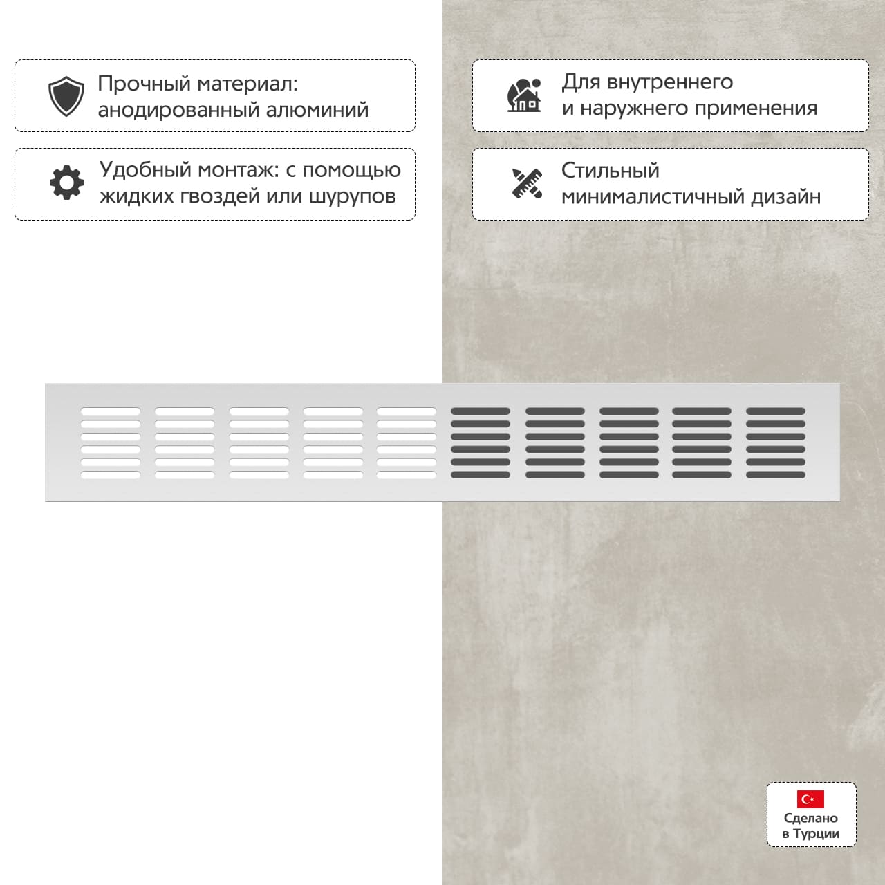 Прямоугольная вентиляционная решетка изготовлена из анодированного алюминия.