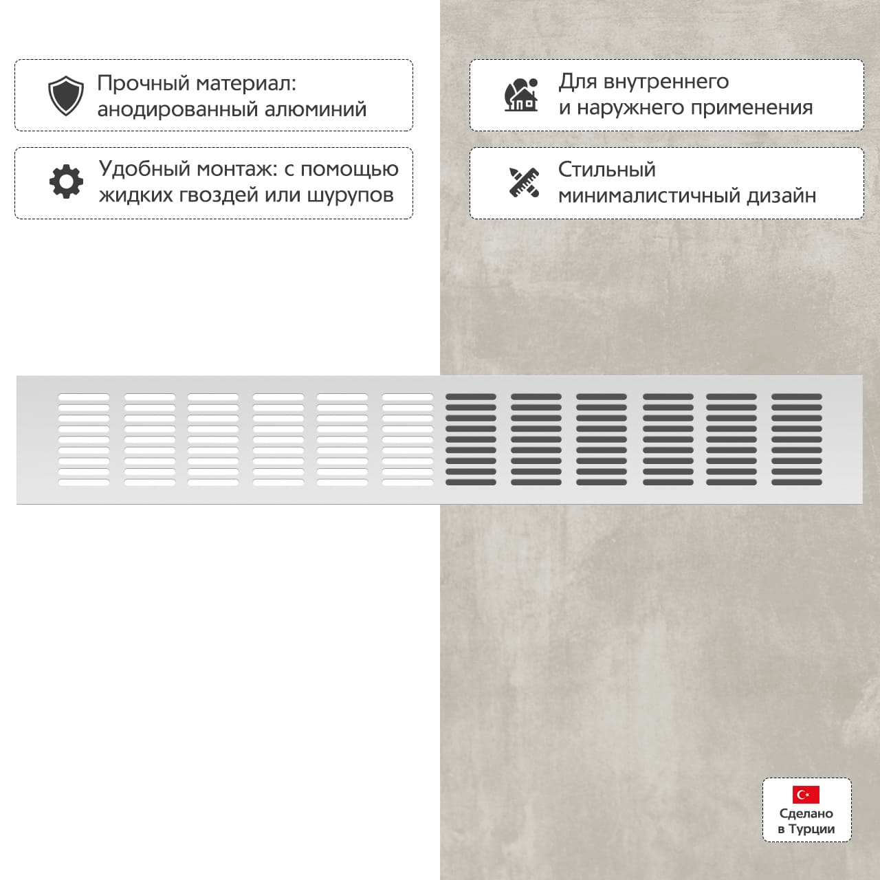 Прямоугольная вентиляционная решетка изготовлена из анодированного алюминия.