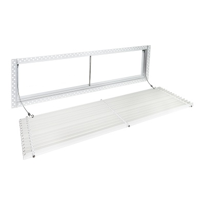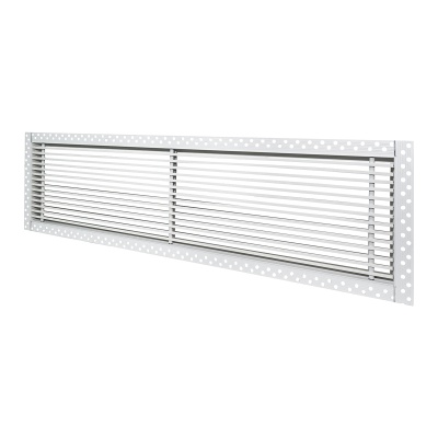 Данная решетка подходит для монтажа на любую поверхность под финишную отделку. Рамка и экран изготовлены из алюминия, опора экрана - из оцинкованной стали. Рама оснащена «полкой» 1,9 мм и рифлеными краями для большей адгезии финишного материала – шпатлевки, цемента. Решетка имеет съемную центральную часть с фиксированным углом наклона ламелей 15°. Она крепится к корпусу прочными металлическими тросиками, легко снимается для очистки и удобного обслуживания.